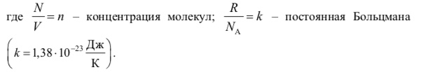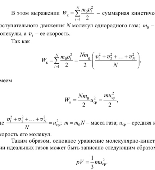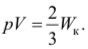 Основное уравнение молекулярно-кинетической теории идеальных газов устанавливает связь между давлением р газа, его объемом V и кинетической энергией Wк хаотического поступательного движения его молекул: