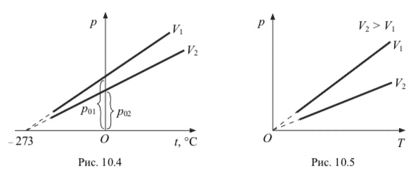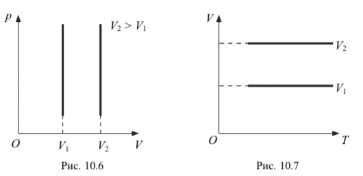 На рис. 10.6 и 10.7 изображены графики изохорного процесса в координатах p, V и V, Т.