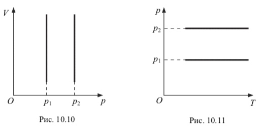 На рис. 10.10 и 10.11 представлены графики изобарного процесса в координатах V, p и p, Т.