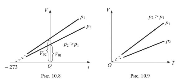 Графически на диаграммах в координатах V, t и V, Т изобарный процесс изображается отрезками прямых, которые называются изобарами (рис. 10.8, 10.9).