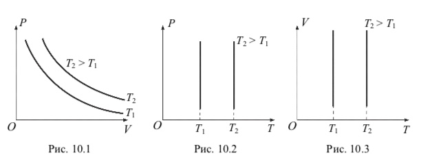 На термодинамической диаграмме в координатах p, V изотермический процесс изображается кривой, которая называется изотермой (рис. 10.1). На рис. 10.2 и 10.3 представлены графики изотермического процесса в координатах p, Т и V, Т.