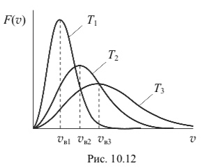 С повышением температуры наиболее вероятная скорость возрастает, поэтому максимум функции распределения молекул по скоростям сдвигается в сторону больших скоростей (на рис. 10.12 Т1 < T2 < T3, и по- этому vв1 < vв2 < vв3).