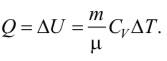 При изохорном процессе (V = const) газ работу не совершает, и все количество теплоты Q расходуется только на увеличение внутренней энергии газа: