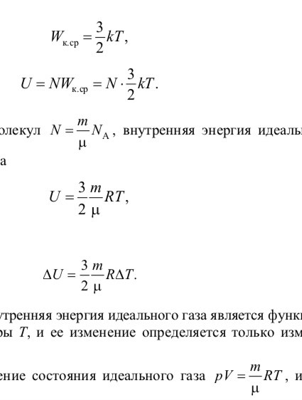 где i – суммарное число степеней свободы молекулы i = iпост + iвращ + 2iколеб. Так как в идеальном газе потенциальная энергия взаимодействия молекул равна нулю, его внутренняя энергия равна сумме энергий молекул, т. е.