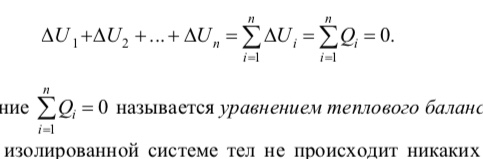 Если в изолированной системе тел не происходит никаких превращений энергии кроме теплообмена, то количество теплоты, отданное телами, внутренняя энергия которых уменьшается, равно количеству теплоты, полученному телами, внутренняя энергия которых увеличивается.