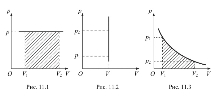 Работа расширения при любом процессе измеряется площадью на pV-диаграмме, ограниченной кривой процесса p = f(V), осью абсцисс и вертикальными прямыми V = V1 и V = V2 (рис. 11.1–11.3), т. е. интегралом