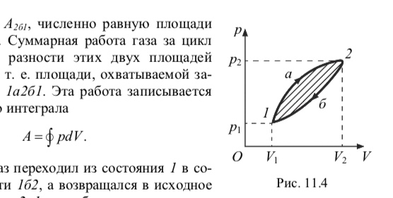 При круговом процессе (цикле) (рис. 11.4) на участке 1а2 газ расширяется и совершает положительную работу А1а2, численно равную площади под указанной кривой. На участке 2б1 газ сжимается и производит отрицательную работу А2б1, численно равную площади под кривой 2б1. Суммарная работа газа за цикл численно равна разности этих двух площадей (А = А1а2 – А2б1), т. е. площади, охватываемой замкнутой кривой 1а2б1. Эта работа записывается в виде кругового интеграла