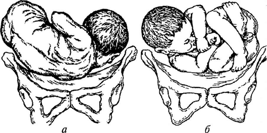 Мал. 10. Поперечне положення плода: а — перша позиція, передній вид; б — друга позиція, задній вид