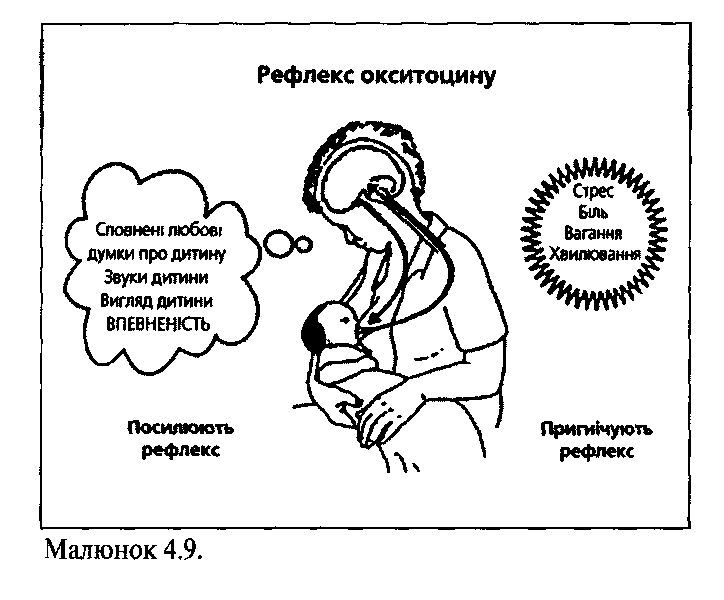 Принциповою особливістю рефлексу виведення молока (окситоцинового) є участь вищих відділів центральної нервової системи і кори головного мозку (мал. 26).