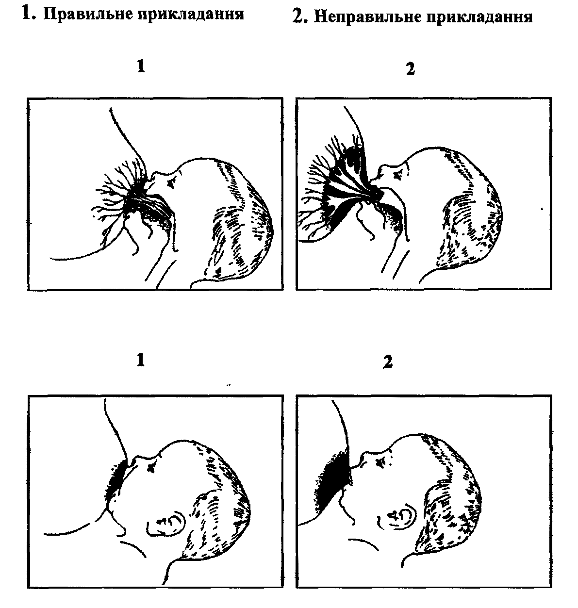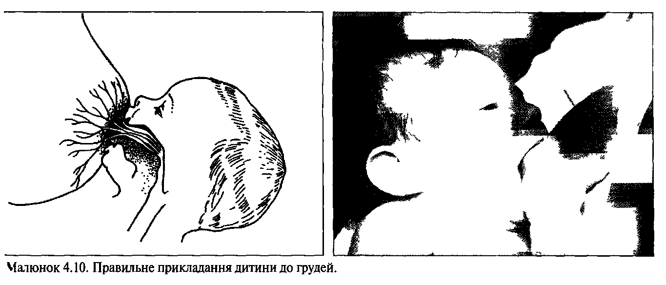 Малюнок 29 демонструє різницю між правильним і неправильним прикладанням дитини до грудей матері. Ознаки правильного прикладання:
