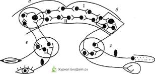 Рис. 1. Схема дуги условного рефлекса с двусторонней связью (по Э.А.Асратяну): а - кортикальный центр мигательного рефлекса; 6 - кортикальный центр пищевого рефлекса; в, г - подкорковые центры мигательного и пищевого рефлексов соответственно; I - прямая временная связь; II - обратная временная связь