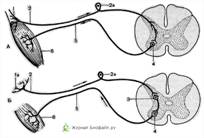 рефлекторная дуга; Б - трехнейронная рефлекторная дуга: 1 - рецептор в мышце и