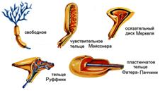 тельца Мейснера, реагирующие на деформацию поверхности кожи на участках, лишенных волосяного покрова, и свободные нервные окончания, выполняющие аналогичную функцию;