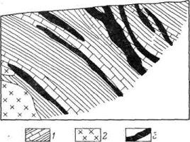 .осадочные породы; 2.интрузии;