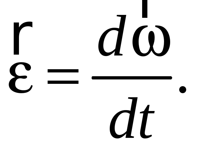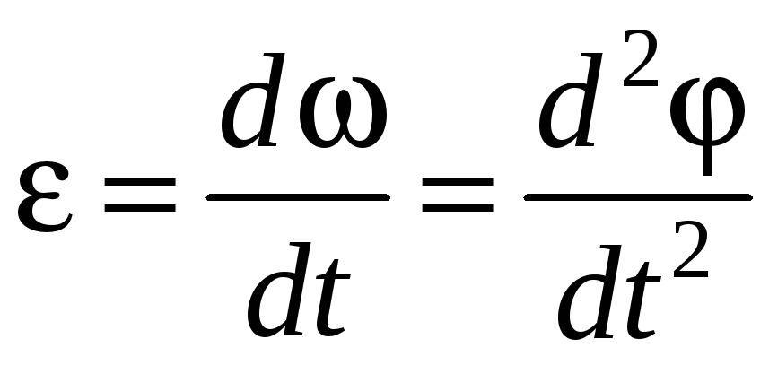 Быстроту изменения угловой скорости характеризует угловое ускорение – векторная величина, равная первой производной угловой скорости по времени или второй производной от угла поворота по времени: