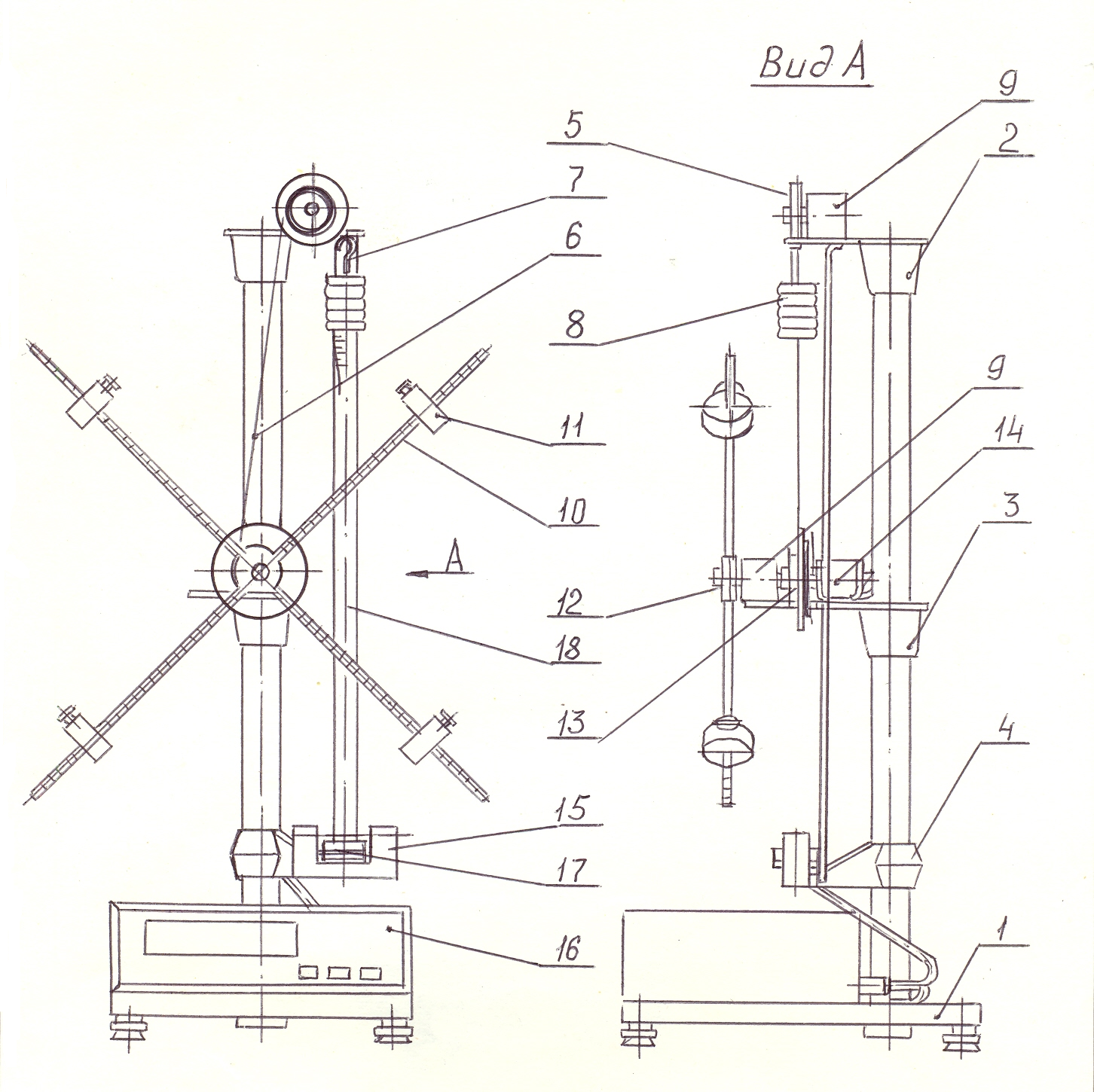 На среднем кронштейне 3 крепится электромагнит 14, который при подаче на него напряжения с помощью фрикциона удерживает систему с грузами в подвешенном состоянии. На этом же кронштейне расположен узел подшипников 9, на оси которого с одной стороны закреплен двухступенчатый шкив 13, на котором имеется приспособление для закрепления нити 6.