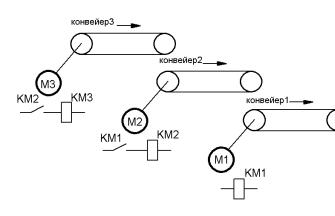 Блокировки в электрических схемах обеспечивают правильный порядок работы схем, исключают ложные и аварийные включения аппаратов и повышают надежность работы схем электропривода. По назначению блокировки разделяются на технологические и защитные. По исполнению блокировки бывают внутренние, осуществляемые между аппаратами одной схемы, как электрические, так и механические (например, в схеме механизма подъема мостового крана), и внешние – между схемами различных электроприводов (например, между схемами последовательно расположенных конвейеров, блокировки предотвращают засыпание конвейера при его остановке, отключая предыдущий конвейер рис. 1.22).