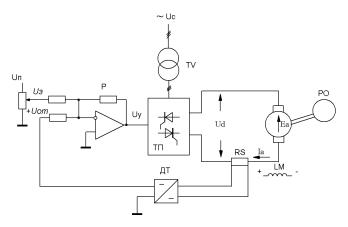 Рис. 3.15. Принципиальная электрическая схема СУЭП с положительной обратной связью по якорному току