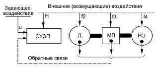– поток механической энергии от двигателя к рабочему органу, штрих – пунктирной линией изображены сигналы обратных связей по координатам электропривода и установки, а вертикальными стрелками (f1 - f4) обозначены возможные внешние возмущающие воздействия (моменты нагрузки, флуктуации напряжений питания и т.п.). Задающее (управляющее) воздействие на входе СУЭП может быть сформировано либо СУЭП верхнего уровня, либо мес тным постом управления.