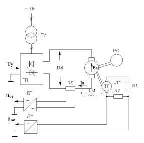 воздействием является напряжение управления Uу на входе ТП. Реализованы обратные связи по якорному току двигателя uот при помощи шунта RS в якорной цепи и датчика тока ДТ и по скорости вращения электродвигателя uос при помощи тахогенератора ТГ , делителя напряжения R1,R2 и датчика напряжения ДН .
