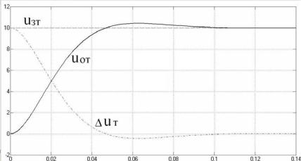 тока, имеет перерегулирование σ = 4,3%, время нарастания tн = 4,7*Тμ = 4,7*0,01 = 0,047 с, ошибка регулирования в статическом режиме ∆uт =