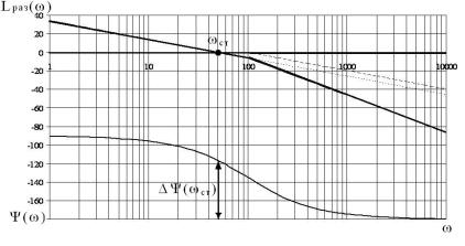 зависимости Ψ(ω) = Ψинт(ω) + Ψинер(ω) = -π/2 – arctg(ωTμ), результат расчета представлен на рис.5.9. Запас по фазе определяется на частоте