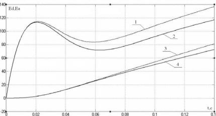 На рис.5.16 показаны переходные процессы ЭДС ТП Ed = f(t) (кривые 1 и 2) и ЭДС электродвигателя Ea = f(t) (кривые 3 и 4) при