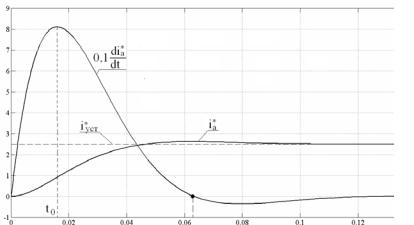 Оценим величину производной якорного тока, которая получается в настроенном на модульный оптимум контуре регулирования якорного тока. Реакция на скачкообразное входное воздействие настроенного на МО токового контура в соответствии с таблицей 1 имеет вид: