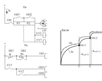 На рис. 1.5,а изображен узел схемы пуска двигателя постоянного тока в функции скорости (ЭДС), а на рис. 1.5,б – переходные процессы изменения ЭДС и напряжения на якоре двигателя во времени.