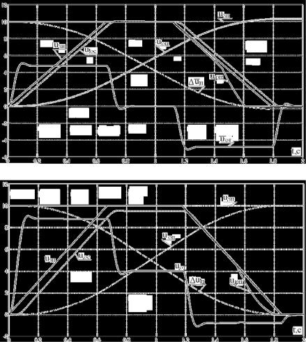 На рис.8.9 представлены переходные процессы позиционной СУЭП при отработке средних перемещений uзп = 3В на холостом ходу (рис.8.9,а) и под нагрузкой (рис.8.9,б).
