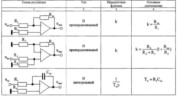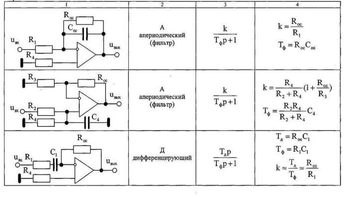 Основные схемы включений ОУ, их передаточные функции и основные соотношения представлены в таблице Б.