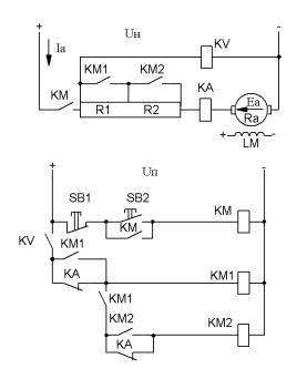 Токовое реле KA настроено таким образом, что его втягивание происходит при величине якорного тока I1, а отпад ание - при I2. При настройке схемы должны выполняться условия: время срабатывания реле KV должно быть больше времени срабатывания реле KA; время срабатывания контактора KM должно быть больше времени срабатывания реле KA.