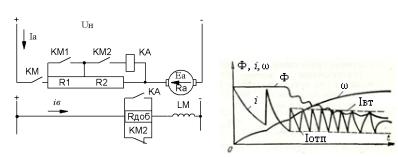 Срабатывание реле KA приводит к включению резистора Rдоб в цепь обмотки возбуждения, увеличению магнитного потока (ЭДС двигателя) и снижению тока якоря. При снижении тока якоря до величины тока отпадания реле KA, реле отключается, что приводит к шунтированию Rдоб, уменьшению тока возбуждения (магнитного потока), дальнейшему росту скорости двигателя и увеличению тока якоря. Таким образом, реле KA работает в вибрационном режиме (рис. 1.14.б) до тех пор, пока бросок тока при ослаблении магнитного потока не будет превышать величины тока втягивания реле KA и двигатель не выйдет на характеристику при ослабленном магнитном потоке и повышенной скорости вращения. В данном случае пуск двигателя до повышенной скорости происходит при контроле величины якорного тока посредством реле тока KA. Чтобы снизить ширину токового коридора, реле KA выполняют с максимально возможным коэффициентом возврата (отношение тока отпадания к току втягивания), равным 0,8…0,85.