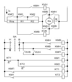 Для осуществления реверса двигателя рукоятку командоаппарата SA переводят в положение Н («Назад»). В результате чего верхний контакт SA размыкается, отключая катушку KMВ, поэтому двигатель отключается от сети, отключается реле KVВ, которое отключает контактор противовключения KMП, размыкающий контакт KMП замыкается и запитывает катушку реле времени KT1, которое размыкает свой контакт и снимает напряжение с катушек KM1 и KM2, размыкающий контакт KM1 подает питание на катушку реле времени KT2, которое срабатывает и размыкает свой контакт в цепи катушки контактора KM2. Таким образом, в якорной цепи двигателя введены пусковые резисторы R1 и R2 и резистор противовключения Rпв. При замыкании нижнего контакта SA получает питание контактор KMН, который своими контактами в силовой цепи изменяет полярность подводимого к двигателю напряжения и подключает катушку реле противовключения для направления «Назад» KVН. Напряжение на катушке реле KVН близко к нулю (рис. 1.10), поэтому реле не срабатывает и его контакт в цепи контактора KMП разомкнут. Двигатель тормозится с введенными резисторами R1, R2 и Rпв (т.2 – т.3 на рис. 1.10). При достижении величины напряжения срабатывания реле KVН втягивается, его контакт в цепи катушки контактора KMП замыкается, контактор KMП срабатывает и шунтирует резистор противовключения Rпв в якорной цепи двигателя, выводя двигатель на реостатную характеристику (т. 4 на рис. 1.10). Затем происходит пуск двигателя в две ступени в функции времени, аналогично пуску в направлении «Вперед».