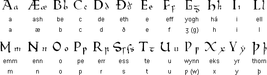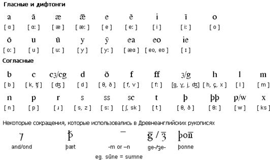 приведен древнеанглийский алфавит и транскрипция всех символов.