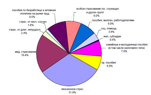 На диаграмме 1. мы видим, что расходы на пенсионное страхование занимают самую высокую долю в социальном бюджете - почти одну треть. За ними следуют расходы на медицинское страхование, а также расходы по выплате пособий по безработице и проведению активной политики в сфере рынка труда. Вместе с расходами по страхованию от несчастных случаев и длительной нетрудоспособности расходы по выплате пособий социального страхования составляют почти две трети всех социальных затрат. На долю расходов по выплате пособий на основе проверки нуждаемости, за исключение помощи безработным, приходится всего лишь меньше 5% всех расходов на социальные нужды.
