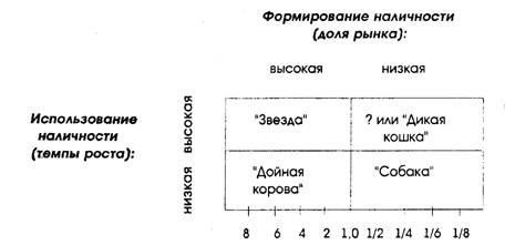 Приведенная на рис. 1,3 матрица может помочь при формировании вариантов и выборе стратегических управленческих решений. Например, если товар занимает большую долю рынка и имеет высокие темпы роста или прибыли («Звезда»), то, скорее всего, следует придерживаться стратегии роста. Но если товар занимает малую долю рынка и имеет низкие темпы роста («Собака»), можно выбрать стратегию отсечения лишнего.