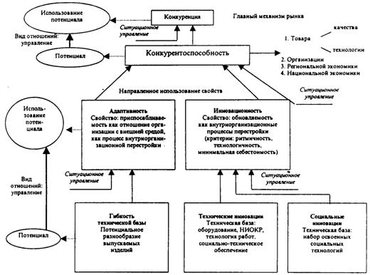 Отношения, связывающие свойство адаптивности и гибкости технической базы, а также свойство инновационности с техническими и социальными новациями, характеризуются как отношения: «использование потенциала и потенциал». Без способности оборудования производить широкий диапазон изделий, реализовывать НИОКР и технологии, осваивать новшества, персоналу менять набор устойчивых образцов своего поведения невозможны обновляемость и адаптивность организации под изменяющуюся внешнюю среду для достижения целей выживания организации в конкурентных условиях.