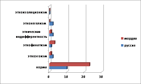 У восьми опрошенных выявились отклонения от "нормы" ,они могут происходить по типу этнической индифферентности, гипоидентичности (этнонигилизм), этноэгоизм, этнофанатизм .