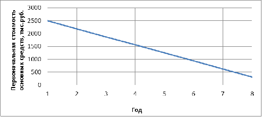 Таблица 2.1. Изменение первоначальной стоимости основных средств при начислении амортизации линейным методом товара А.