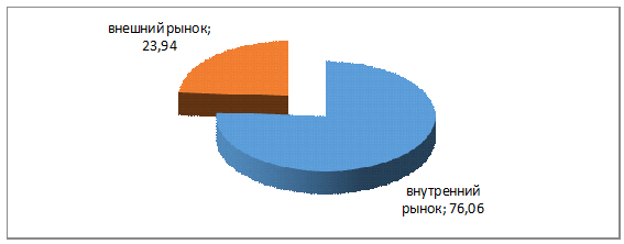 По данным таблицы 2.1 и рисунка 2.1 можно сделать вывод, что структура поставок за анализируемый период практически не изменилась. В 2012 году объем продукции, реализованной на внешнем рынке, составил 2218 млн. руб. (76,06%), а на внутреннем - 698 млн. руб. (23,94%).