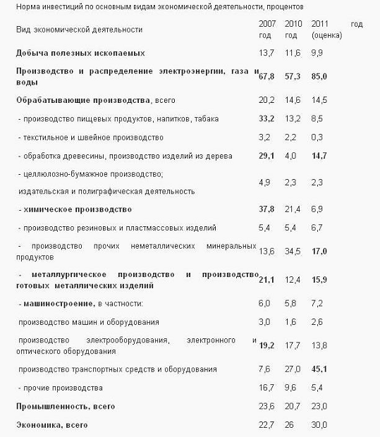 Таблица 4 - Норма инвестиций по основным видам экономической деятельности за 2007- 2011 гг.