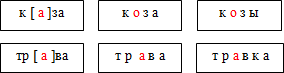 Ещё раз произнесите эти слова; найдите слова, в корне которых слышатся похожие безударные гласные звуки (дети называют слова трава, коза и поясняют: в этих словах слышим звук [а]).