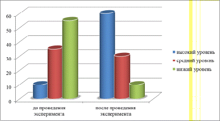 Согласно информации, представленной в приложении 6, число детей, обладающих высоким уровнем развития увеличилось на 50%, число детей обладающих средним уровнем развития сократилось на 5%, число детей, обладающих низким уровнем развития сократилось на 45%.