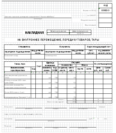 Пример накладной на внутренне перемещение