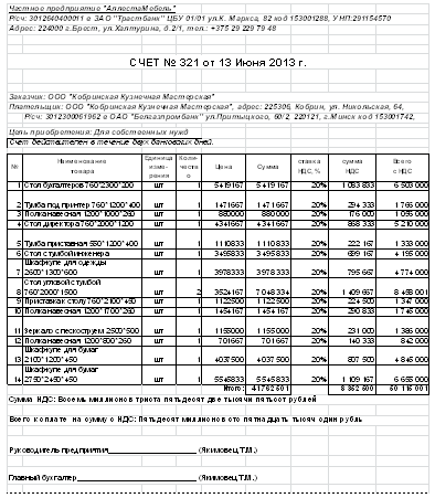 Пример оформления счета заказчику