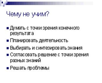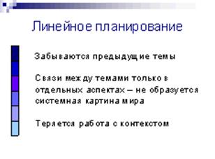 С другой стороны, прилагательные тоже имеют род, число и склонения. И по всем признакам они должны быть согласованы с существительными. Но изучаются они отдельно, с большим отрывом по времени. Как и другие части речи. И общая системная картина обо всех частях речи не образуется. Без такой картины невозможна работа с более широким контекстом. В статье о приватизации городского парка ребята не умеют определить проявления экономических механизмов, анализировать ситуацию с разных точек зрения - хотя все необходимые темы они проходили. Линейное планирование поддерживает проблемы образования и не позволяет структурировать содержание под проблемы [12].