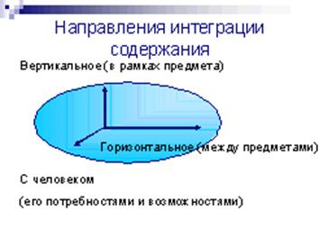 Горизонтальная интеграция содержания в массовой практике проявляется через межпредметные связи. Для расчетов по физике и химии необходимы знания математики, которые формируются заранее. Практически для всех предметов нужны навыки чтения, которые осваиваются в первую очередь. Но межпредметные связи не всегда учтены учебными программами. Например, на уроках труда для приготовления еды используются расчеты по пропорциям, а в математике их еще не проходили. На уроках литературы, следуя принципу хронологии, сначала изучается фольклор. Но по истории древние времена и их культура еще не изучались. Ведь программа каждого предмета строится по своей внутренней логике, а требования с точки зрения других предметов будут вызывать противоречия. Но даже максимальное согласование предметов не решит проблему освоения разрастающегося объема содержания в ограниченном времени. Для этого нужны более свернутые формы интеграции.