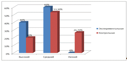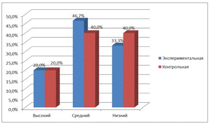 детей ЭГ и 20% детей КГ, средний - 46,7% детей ЭГ и 40% детей КГ, низкий -