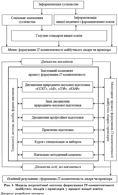 Змістовний компонент розробленої моделі педагогічної системи передбачає, що формування ІТ-компетентності майбутніх лікарів і провізорів у межах вищої освіти відбувається також і під час навчання іншим ДПНП, дисциплінам професійної підготовки, вивчення курсів за вибором, а також за результатами практичної підготовки. Але ядром міждисциплінарної інтеграції в процесі формування ІТ-компетентності є саме ДПНП «ЄСКГ», «МІ», «ІТФ»,«КМФ» [13].